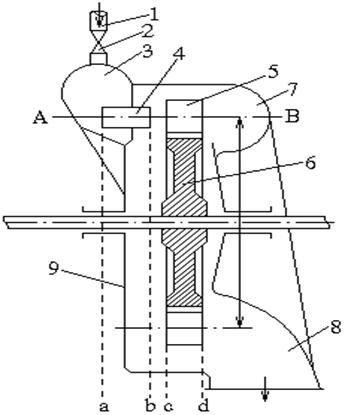 1- conductă de abur; 2 - ventil de reglare; 3 - canal în treapta cu actiune a turbinei Laval pentru distributia aburului; 4 - ajutaj; 5 - palete mobile; 6 - discul rotorului; 7 - canal pentru colectarea aburului; 8 - racord de evacuare; 9 - carcasa turbinei.