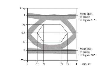 In aceasta Recomandare, caracteristicile formei impulsului transmitatorului general inclusiv timpul de crestere, timpul de cadere, impulsul overshoot, impulsul undershoot, si sunet, care ar trebui sa fie controlate pentru a preveni degradarea excesiva a sensibilitatii receptorului, sunt specificate in forma unei mastii transmitatorului diagramei ochiului la punctul MPI-S. In scopul evaluarii semnalului transmis, este important sa se ia in considerare nu numai deschiderea ochiului, ci si limitarile overshoot si undershoot. Parametrii care specifica masca diagramei ochiului a transmitatorului sunt aratate in Figura 2. Anexa A cosidera mai multe aspecte ale definitiilor mastii ochiului.