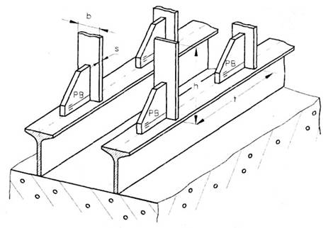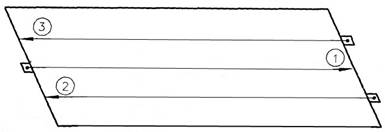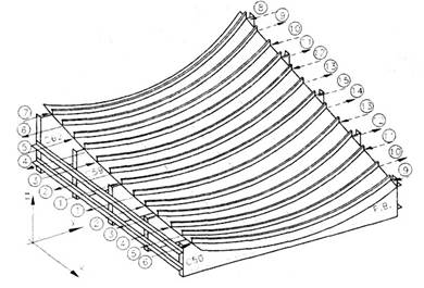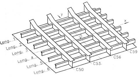 In aceasta etapa se verifica trasajul liniilor teoretice ale osaturii intarite, dupa care osatura este pozitionata in raport cu liniile teoretice urmand a se asambla in puncte de sudura. In etapa urmatoare se trece la sudarea osaturii de panou, pe baza schemei de sudare stabilite. Schita axonometrica a acestei etape este prezentată 313j98d ; in fig. 8.
