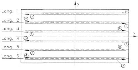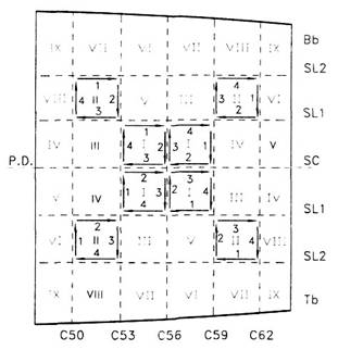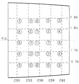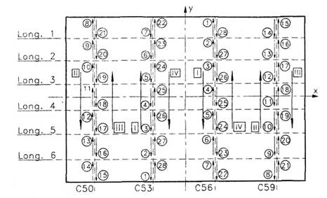 In aceasta schema, cu cifre romane si cifre arabe este precizata schema de sudare a osaturilor de panoul dublului fund, indicandu-se sensurile de sudare numai pentru opt celule (celulele I si II). Schema respecta regulile precizate anterior si urmareste totodata reducerea timpilor auxiliari consumati la schimbarea celulei abordate.
