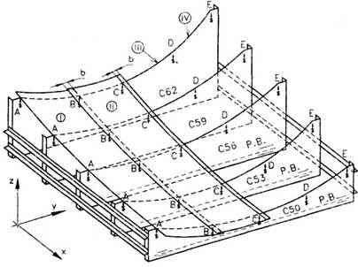 I Aceasta etapa este identica etapei similare de la asamblarea sectiilor plane. Dupa sudarea tablelor panoului dublului fund, acesta este pozitionat pe suprafata de sprijin materializata de platoul de asamblare de tip stelaj. In lipsa unui astfel de platou, suprafata de sprijin va fi materializata prin placute sudate pe sinele de cale ferata incastrate in pardoseala halei atelierului de asamblare. Se recomanda ca placutele sa fie consolidate cu diagonale sau gusee, iar abaterea de la planeitate a punctelor de sprijin (numite si reglaje) trebuie sa fie de ± 1 mm. Fixarea placutelor si verificarea planeitatii se face cu ajutorul teodolitului si a nivelei cu tub flexibil, t