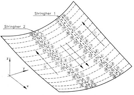 Trebuie subliniat faptul ca sudarea fiecaruia din cele patru cordoane trebuie facuta dupa racirea completa a cordonului sudat anterior la acelasi nod. Sub acest aspect, metoda prezentata desi conduce la tensionarea minima a sectiei, presupune un consum de timp mai mare, datorita timpilor de asteptare, cat si a celor consumati pentru deplasarea sudorului dintr-o celula in alta pentru sudarea fiecarui nod. Rezultate bune pot fi obtinute si prin sudarea pe rand a celor patru cordoane verticale din fiecare celula. In acest caz, ordinea de sudare a celulelor va fi cea indicata cu cifre romane si coincide cu cea adoptata la sudarea osaturii intarite de panou. Astfel verticalele vor fi sudate in fiecare celula incepand cu verticala situata in punctul de incept al cordonului 1 si se va continua cu celelalte verticale in sensul dat de sagetile sensurilor de sudare ale schemei in sistem celular din figura 17b.
