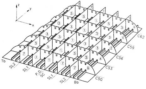Asamblarea acestor elemente de osatura intarita incepe cu pozitionarea si asamblarea suportului central dupa care se continua cu asamblarea unei varange situate la mijlocul lungimii sectiei (varanga de la C56 - fig. 15a). In continuare, se avanseaza simultan pe patru fronturi de lucru, mergand spre extremitati, simultan in cele doua borduri. Astfel, se asambleaza panourile suportilor laterali situate intre C53 si C59 (ce se intrerup la varange), se continua cu inca patru varange, din nou cu suportii laterali, etc, pana se ajunge la cele doua extremitati pupa si prova ale sectiei. Pe masura ce se avanseaza se fac ajustarile necesare datorate erorilor acumulate in procesul de fabricatie, astfel incat sa se asigure verticalitatea si dispunerea corecta pe liniile teoretice a elementelor de osatura mentionate. In cazul inaltimilor mari ale acestora, verticalitatea se asigura temporar cu ajutorul unor diagonale cu intinzatori.