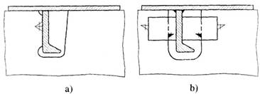 In continuare, sectia se desprinde de platou si se rastoarna dupa care se trece la sudarea invelisului de suporti si varange, la fel ca in prima varianta prezentata. in acest caz, decuparile din varange vor fi de tipul celor din fig. 17b (cu toleranta larga), legatura dintre varange si longitudinale realizandu-se cu ajutorul unor placute de rigidizare. Aceasta varianta conduce la tensiuni mai reduse pentru sectia in ansamblu, deoarece imbinarile cap la cap ale tablelor de invelis precum si cele de colt ale longitudinalelor nu mai tensioneaza si restul sectiei.