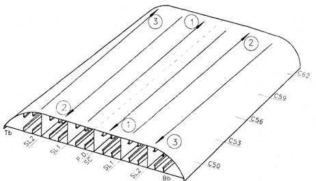 3. Etapa a IlI-a - asamblarea si sudarea osaturii intarite Succesiunea operatiunilor in aceasta etapa este similara celei prezentate la asamblarea si sudarea sectiilor plane cu precizarile suplimentare facute la etapa anterioara (etapa a Ii-a) de asamblare a sectiilor curbe. Schema de sudare in aceasta etapa corespunde cazului in care sudarea osaturii simple s-a facut in etapa a II-a. In caz contrar, atunci cand nu este posibila sudarea semiautomata, schema de sudare va corespunde situatiei mai convenabile in care sudarea tuturor elementelor de osatura se face in final, dupa asamblarea integrala a acestora.