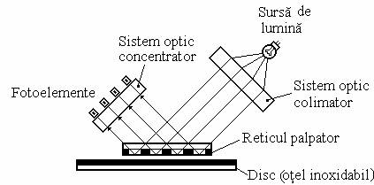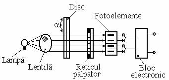 Īn acest caz reteaua optica este dispusa pe un disc de sticla si consta īn zone transparente alternate cu interstitii opace. Lumina generata de sursa este dirijata printr-un sistem de lentile optice paralel prin disc spre reticulul palpator - figura 4.38. Cānd discul se roteste īn raport cu capul de citire, intensitatea luminoasa ce actioneaza asupra fotoelementelor variaza periodic, iar variatiile de intensitate sunt transformate de fotoelemente īn semnale electrice.