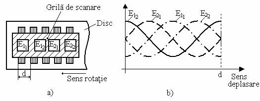 Sistemul de obtinere si prelucrare a semnalelor este acelasi indiferent de procedeul de masurare utilizat. Cel mai raspāndit sistem de citire utilizeaza o grila de scanare avānd patru ferestre pozitionate astfel īncāt semnalele de iesire ale fotoelementelor sunt decalate cu un sfert de perioada, ceea ce conduce la obtinerea a patru semnale sinusoidale decalate fiecare cu 90 (figura 4.40-b.).