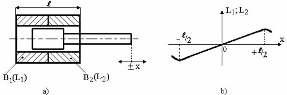 De asemenea, apar forte parazite de atractie dintre miez si bobina. Aceste dezavantaje se elimina prin utilizarea a doua bobine (B1 si B2) legate diferential (figura 4.2 - a) care asigura o caracteristica mult mai liniara, prezentata īn figura 4.2 - b, iar sensibilitatea traductorului creste. Īn pozitia de referinta (x = "0"), miezul feromagnetic este echidistant fata de capetele interioare ale bobinelor B1 si B2.