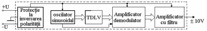 Traductoarele cu elemente sensibile de tip TDLV folosesc ca adaptor un redresor sensibil la faza, eventual precedat de un amplificator de curent alternativ. Iesirea din redresorul sensibil la faza se aplica unui amplificator de curent continuu cu impedanta de iesire mica, care este prevazut si cu un circuit de filtrare (trece-jos) pentru eliminarea armonicelor parazite. Īn figura 4.6 se prezinta adaptorul pentru un element sensibil de tip TDLV.