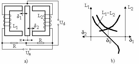 Pentru ameliorarea liniaritatii si pentru cresterea sensibilitatii se utilizeaza montajul diferential din figura 4.8-a pentru care se observa, īn figura 4.8-b, variatiile inductivitatilor L1 si L2, cāt si variatia diferentei inductivitatilor (L1-L2) īn raport cu īntrefierurile d si d , care, la rāndul lor, depind de valoarea deplasarii x.