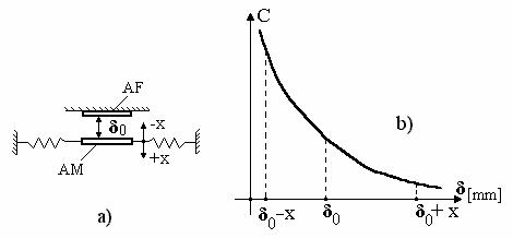 Fig. 4.10 - Element sensibil capacitiv cu modificarea distantei dintre armaturi: a- solutie constructiva; b - caracteristica statica