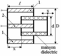 Īn varianta de baza, un astfel de element sensibil este realizat din doi electrozi cilindrici ficsi 1 si 2 (figura 4.14) īntre care se deplaseaza un manson izolator (cu o constanta dielectrica diferita de cea a aerului) alunecānd cu frecare minima. Electrodul fix 2 este plasat echidistant fata de peretii electrodului cilindric 1, iar mansonul dielectric( de forma cilindrica) este coaxial electrodului fix 2.