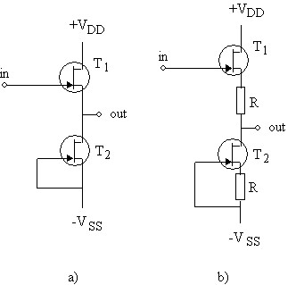 doua tranzistoare NMOS sant comandate prin legarea fiecarei porti la un etaj de