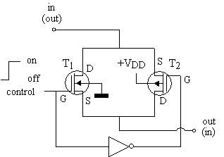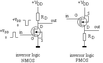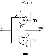 Comutatorul descris este numit inversor CMOS (complementary MOS) si formeaza structura de baza a familiei de circuite logice CMOS, dominanta printre circuitel integrate pe scara mare (LSI - large scale integrated), destinata sa anlocuiasca familia TTL (transistor transistor logic), realizata cu tranzistoare bipolare. Vom reveni pe larg an capitolul dedicat circuitelor logice.