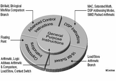 DSP-ul poate sustine un singur ciclu dual MAC, moduri de adresare tipice DSP-urilor, saturatie, Q-Math, Rounding.