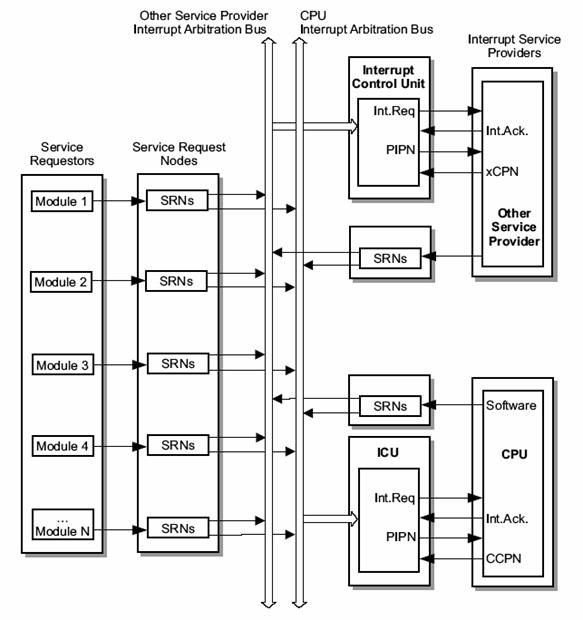 Intr-un TriCore, exista posibilitatea ca mai multe surse periferice sau intrari externe sa genereze un semnal de intrerupere la CPU pentru a cere un serviciu. De asemenea sistemul de intrerupere de asemenea suporta implementarea de unitati care sunt capabile sa lucreze cu cereri de intrerupere, cum ar fi un al doilea procesor, un DMA standard sau un PCP(Peripheral Control Processor). Astfel de unitati sunt cunoscute sub numele de "furnizori de servicii", iar cererile de intreruperi sunt numite "serviciu de cereri".Pe langa procesorul principal, exista pana la trei furnizori suplimentari de servicii care pot fi apelati cu intrerupere SRN (Service Request Node). Fiecare intrerupere sau serviciu de cerere care vine de la un modul, se conecteaza la un Nod de serviciu de cerere(Service Request Node), care contine un registru de control al serviciilor de cerere(SRC).