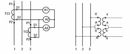 Schemele de conectare ale transformatoarelor de masurare de curent si de tensiune, în circuit trifazat fara conductor neutru, sunt prezentate în fig.1. Neglijând erorile de raport si de unghi se pot scrie relatiile: