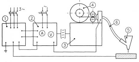Figura 1. Instalatie pentru sudarea semiautomata sub strat de flux. 1- sursa de sudare; 2- cutia de distributie cu aparatajul de control; 3- mecanismul de avans al sarmei electrod; 4- tambur cu sarma electrod; 5- cap de sudare cu palnia pentru de flux; 6- tub flexibil.