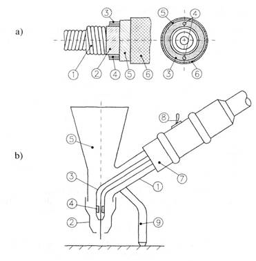 Tubul flexibil special (fig. 2a) serveste pentru inaintarea sarmei electrod. El este alcatuit dintr-o spirala dubla de otel (1), din firele de alimentare a arcului (3) care asigura si transmiterea comenzilor de pornire-oprire prin circuitul de comanda (4). Cablul flexibil este acoperit cu o camasa de bumbac (5), imbracata la exterior cu cauciuc (6).