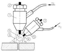 Sudarea in hidrogen atomic (arc-atom) se face cu un arzator special, arcul formandu-se intre doi electrozi de wolfram legati la o sursa de curent alternativ (ca.)- Coaxial cu electrozii se trimite jetul de hidrogen care trece in zona arcului printr-un spatiu inelar format intre electrod si ajutajul electrodului (fig. 3).
