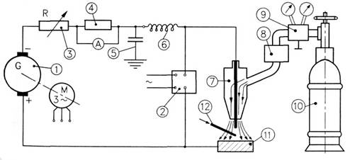 1 - generator de sudare; 2 - oscilator; 3 - rezistenta de balast; 4- ampermetru; 5- condensator; 6- bobina; 7- arzator; 8- debitmetru; 9- reductor de presiune; 10- butelie.