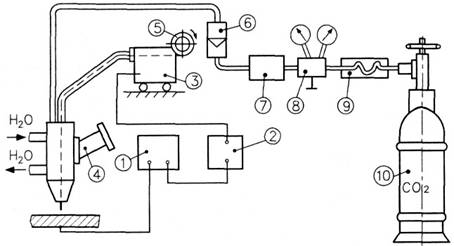 1 - sursa de curent; 2 - tabloul de comanda; 3 - mecanism de avans; 4 - cap de sudare; 5 - tambur sarma; 6 - debitmetru; 7 - uscator gaz; 8 - reductor de presiune; 9 - incalzitor gaz; 10 - butelie CO2.