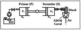 In circuitul primar, o pompa hidraulica furnizeaza ulei la o presiune de 180200 bar, care ataca primarul amplificatorului hidraulic (P in figura 19.). In secundar apa este comprimata de catre pistonul S, presiunea rezultata fiind dedusa din egalitatea: