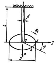 Sa se calculeze pulsatia proprie a vibratiilor torsionale ale sistemului oscilant din figura 1, format dintr-un arbore de otel, de diametru d si lungime l, precum si doi volanti, sub forma de discuri pline, de greutati P1, P2 si diametre D1, D2 . Se neglijeaza masa proprie a arborelui. Aplicatie numerica: d = 4 cm, l = 200 cm, P1 = 100 kgf, P2 = 200 kgf, D1 = 40 cm, D2 = 60 cm.