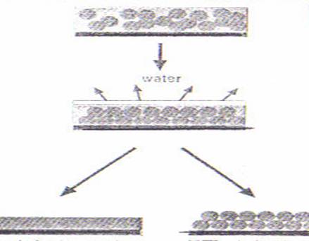 Folosind cea mai buna tehnologie, pot fi formulate sisteme de uscare la fel de rapid ca si vopselele pe baza de solvent, cu timp de uscare a pudrei de mai putin de 90 minute la o temperatura ce se incadreaza intre 50C si 200C. Totusi, in tehnologiile de emulsii utilizate de toate sistemele actuale, particulele de emulsie trebuie sa fie tratate prin coalescenta. Acest fapt poate avea loc doar prin depasirea temperaturii minime de formare a peliculei (MTF). In plus, timpul de uscare va depinde in mod clar de capacitatea apei de a se evapora. In conditii de aer statut, umed, este posibil ca vopseaua sa ramana « uda » pe durata nedefinita, in care caz, particulele emulsionate pot fi tratate individual fara pierdere de apa, eliminand orice posibilitati de tratare ca pelicula coeziva.