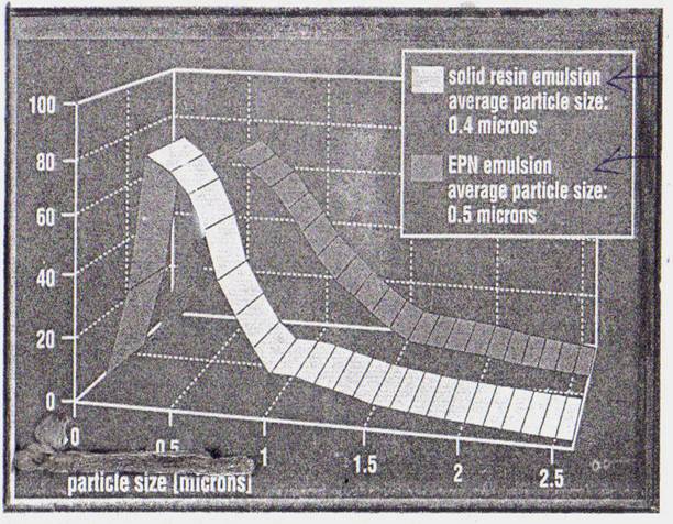 Pe langa avantajele ecologice evidente, epoxidicele pe baza de apa se preteaza foarte bine la o gama foarte variata de substraturi cum ar fi : materiale plastice, beton umed si pelicule vechi de vopsea. De asemenea, sistemele pe baza de apa si-au dovedit eficienta ca vopsele de legatura pentru epoxidicele liant pentru podea, fara solvent, pentru umezirea betonului. Cand se obtine o buna coaelescenta a peliculei, produsele formeazxa vopsele ecran anticorozive, in special produse pe baza de epoxidicelichide de mare functionalitate (epoxi fenol novolac – EPN). Marimea particulei de emulsie este esentiala pentru formarea si stabilitatea peliculei iar curbele de distributie tipice ale marimii particulelor sunt prezentate in Figura 2.57..