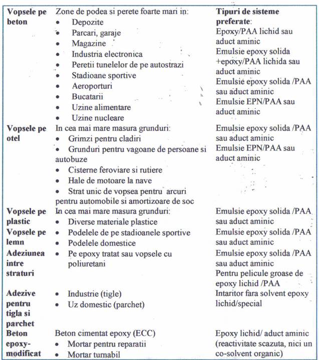 Epoxidicele emulsionate in doua componente ne arara o reducere a proprietatilor cand sunt comparate cu sistemele pe baza de solvent. Totusi, cele mai bune produse pot fi util substituite cu epoxidice conventionale pe baza de solvent, cu exceptia cazului in care sunt folosite in medii puternic acide. Complexitatea tehnologiei este determinata de nevoia de a formula retete care sa aiba proprietati corespunzatoare utilizarii finale, asa cum se arara in Tabelul 2.16. Se poate observa ca se cere o gama intreaga de tipuri de produse [15].