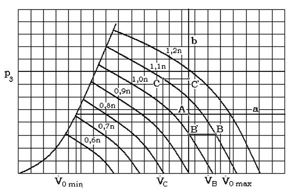 Asa dupa cum rezulta din fig. 6.2.a. linia a de presiune constanta, poate fi realizata prin variatia turatiei între 0.9n si 1.2n , când debitul variaza între V0 min si