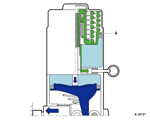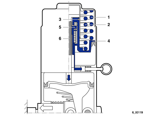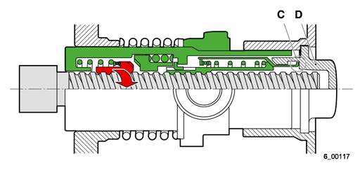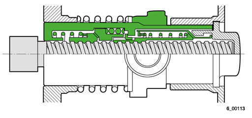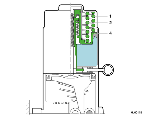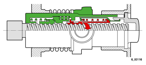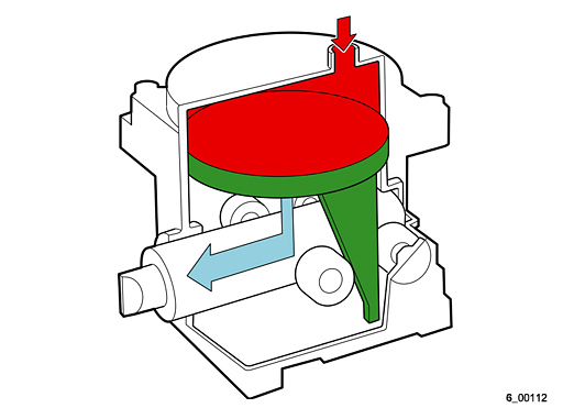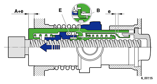 Blocul de frana utilizeaza o singura dimensiune de cilindru de frana pentru toate tipurile de aplicatii. Amplificarea fortei de franare a blocului de frana se bazeaza pe principiul penei. Cele doua pene de la capul pistonului cilindrului de frana sunt pozitionate de o parte si de alta a tijei de impingere a mecanismului dispozitivului de ajustare a jocului; datorita acestei configuratii, unitatea este foarte compacta. Penele sunt durificate la suprafata si actioneaza intre doi rulmenti cu role, foarte rezistenti la sarcini mari, ca un amplificator de forta cu o foarte mare eficienta. Cand presiunea aerului actioneaza asupra capului pistonului, penele sunt impinse in jos intre rulmentii cu role si preseaza in fata rulmentii frontali mobili, care prin mecanismul dispozitivului de ajustare a jocului transmit forta rezultata la sabotul de frana. Prin utilizarea unor unghiuri diferite ale penelor, amplificarea fortei se poate adapta pentru a corespunde anumitor cerinte. Forta maxima rezultata poate sa fie reglata intre 13 kN si 70 kN pentru franarea de serviciu.