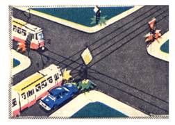 Autoturismul din imaginea alaturata a asteptat la semafor, împreuna cu tramvaiul, aparitia culorii verzi. Care va trece primul prin intersectie? a) Tramvaiul 1 , deoarece are prioritate; b) autoturismul, deoarece circula pe directia înainte; c) tramvaiul 1, deoarece este un mijloc de transport public. |