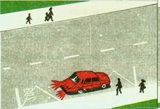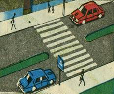 Care dintre cele doua autoturisme din imagine trebuie sa opreasca într-o asemenea împrejurare? a) nici unul, întrucât în acest moment pietonii nu sunt angajati în traversarea strazii; b) numai autoturismul albastru; c) ambele autoturisme pentru a acorda prioritate de trecere pietonilor care urmeaza sa se angajeze în traversare. |