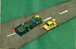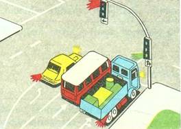 Conducatorul autoturismului verde din imaginea alaturata intentioneaza sa vireze la stânga. Cum trebuie sa procedeze în aceasta situatie? a) întrucât vine de pe o artera cu prioritate va trece primul prim intersectie; b) permite trecerea celor doua autovehicule, întrucât urmeaza sa vireze spre stânga; c) permite trecerea autocamionului care circula pe artera prioritara pe directia înainte si apoi vireaza la stânga. |