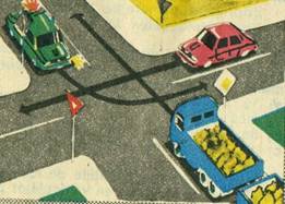 Care este ordinea de trecere a celor trei vehicule prin intersectia din imaginea alaturata? a) bicicleta, autoturismul, motocicleta; b) autoturismul, motocicleta, bicicleta; c) motocicleta, bicicleta, autoturismul. |