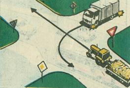 Care dintre cei doi conducatori trebuie sa opreasca pentru a ceda trecerea în intersectia din imagine? a) cel care ajunge al doilea în intersectie; b) soferul autodubei; c) tractoristul. |