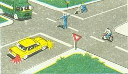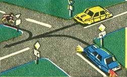 În ce ordine vor trece conducatorii celor trei vehicule prin intersectia din imagine? a) bicicleta, autoturismul de culoare galbena si cel albastru; b) bicicleta, autoturismul de culoare albastra, autoturismul galben; c) autoturismul de culoare albastra, bicicleta, autoturismul galben. |