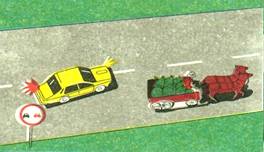 În situatia din imagine, conducatorul autoturismului are voie sa efectueze depasirea carutei? a) da, deoarece procedeaza regulamentar; b) nu, deoarece indicatorul interzice depasirea vehiculelor; c) nu, deoarece încalca marcajul care separa cele doua sensuri de circulatie. |