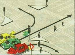 Cele trei autoturisme au ajuns simultan în intersectia din imagine. În aceasta situatie, caruia dintre conducatorii auto îi revine obligatia de a acorda prioritate de trecere? a) nici unuia, întrucât lumina de culoare verde a semaforului le permite sa-si continue drumul în deplina siguranta; b) conducatorul auto care vireaza la stânga; c) conducatorul auto care vireaza la dreapta. |