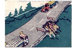 În imaginea alaturata, tractorul coboara o panta, iar autocamionul, care este si încarcat urca. Cine are obligatia sa acorde prioritate de trecere în zona în care drumul s-a surpat? a) autocamionul; b) tractorul; c) nici unul, deoarece axul drumului este marcat cu linie discontinua. |