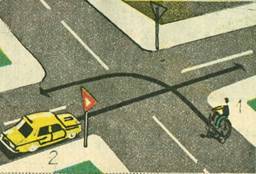 La întâlnirea caruia dintre cele doua indicatoare conductorii auto au prioritate? a) la indicatorului 2; b) la ambele indicatoare; c) la nici unul; în aceste împrejurari actioneaza principiul prioritatii de dreapta. |