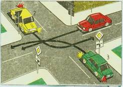 Cum va trebui sa procedeze conducatorul autoturismului 1, în situatia din imaginea alaturata? a) acorda prioritate autoturismului 3, dupa care îsi continua deplasarea; b) acorda prioritate de trecere autoturismelor 3 si 2, dupa care îsi continua deplasarea; c) trece primul întrucât se deplaseaza pe directia înainte. |