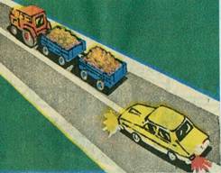 Priviti imaginea alaturata. Care din cei doi conducatori procedeaza neregulamentar, soferul care depaseste sau tractoristul care a oprit? a) tractoristul; b) conducatorul autoturismului; c) ambii conducatori procedeaza regulamentar. |