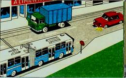 Conducatorul autoturismului din imaginea alaturata efectueaza regulamentar depasirea? a) da; b) nu, deoarece trebuie sa acorde prioritate troleibuzului oprit în statie; c) nu, deoarece se afla la mai putin de 50 m de troleibuzul oprit în statie. |