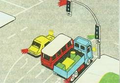 Care dintre cele trei autovehicule ajunse în intersectia din imagine pot sa-si continue deplasarea? a) autovehiculele angajate pe prima si a doua banda de circulatie; b) nici unul; c) numai autoturismul, întrucât culoarea semaforului îi permite acest lucru. |