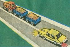 Conducatorul autoturismului din imaginea alaturata procedeaza regulamentar angajându-se în depasirea tractorului? a) da, deoarece prin exceptie, în asemenea situatii vehiculele lente pot fi depasite; b) da, pentru ca tractorul are atasate doua remorci; c) nu, deoarece încalca marcajul axial. |