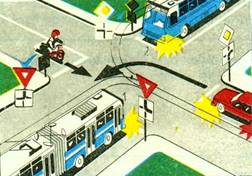 Care este ordinea de trecere a autovehiculelor ajunse simultan în intersectia din imaginea alaturata? a) troleibuzul 1, troleibuzul 2, motocicleta, autoturismul; b) troleibuzul 2, autoturismul, troleibuzul 1, motocicleta; c) troleibuzul 2, autoturismul, motocicleta, troleibuzul 1. |