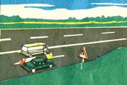 Care dintre cele doua autovehicule din imaginea alaturata, va patrunde primul în sectorul de drum îngustat? a) microbuzul, deoarece nu-si schimba pozitia de mers; b) autoturismul, deoarece se deplaseaza cu o viteza mai mare; c) autoturismul deoarece circula din partea dreapta. |